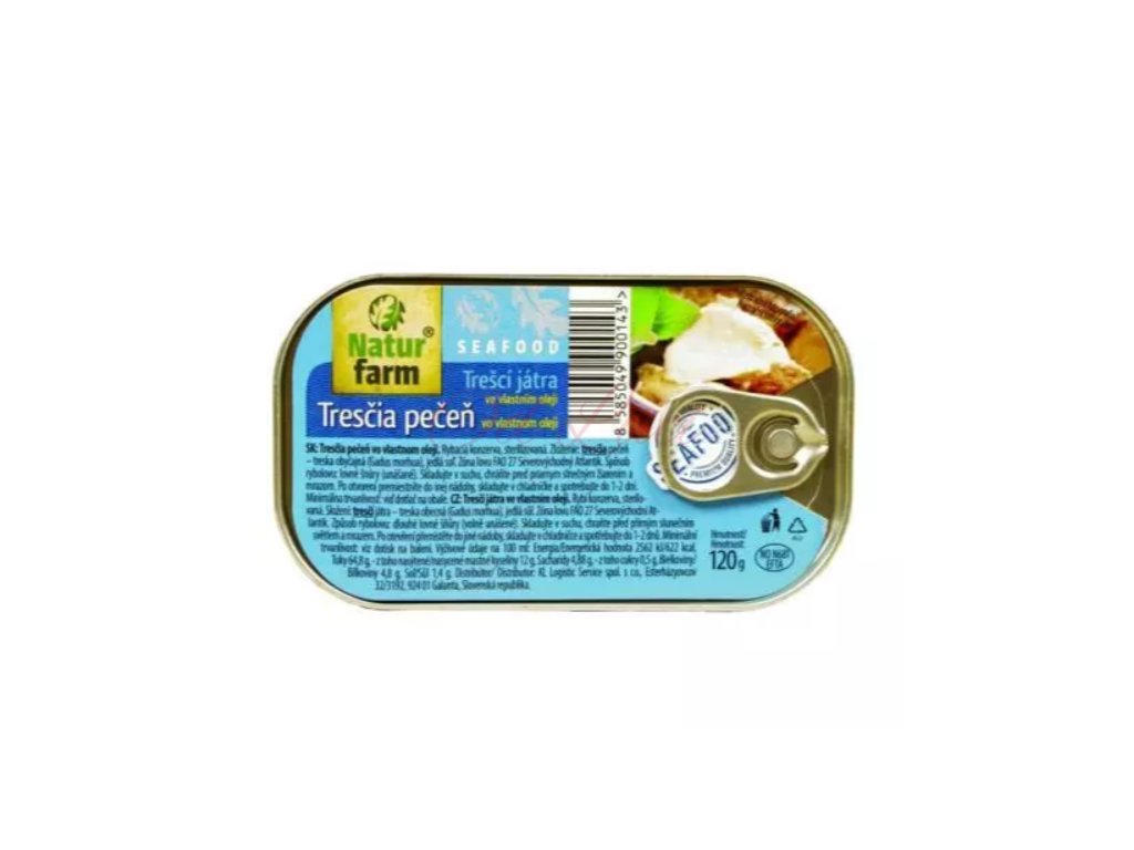 Tresčí játra ve vlastním oleji 120g - NaturFarm je prémiový produkt z čerstvých tresčích jater (Gadus morhua).