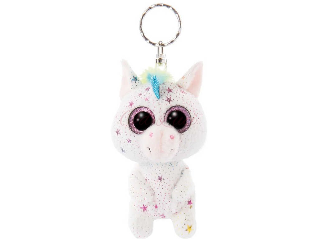Jednorožec Uberto je skvělý barevný přítel, který je pokrytý třpytivými hvězdičkami. Bílý plyš a růžové třpytivé oči z něj dělají skvělého společníka, který vám vždy vykouzlí úsměv na tváři. Plyšový přívěsek na klíče.