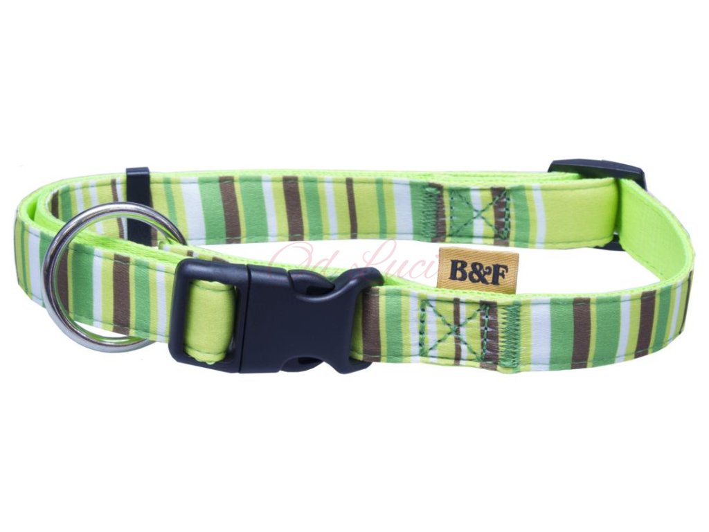 Obojek z popruhu s motivem proužku je z velmi měkkého a příjemného materiálu. Zapínání na plastovou přezku, snadno nastavitelný obvod. Před zapnutím provlékneme jistícím kroužkem, který také slouží k připnutí vodítka.