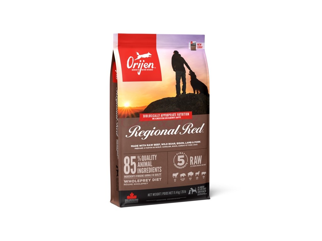 ORIJEN REGIONAL RED je plný proteinů pocházejících z hovězího, divokého kance, bizona, jehněte a tradičního kanadského vepřového. Všechny suroviny jsou nám dodávány místními dodavateli vždy čerstvé nebo syrové v bohatě výživném podílu Celá kořist. S hrdostí připravujeme ORIJEN v našich vítězně oceňovaných kuchyních NorthStar®. Krmiva ORIJEN zaručí, že váš milovaný pes bude zdravý, spokojený a silný.