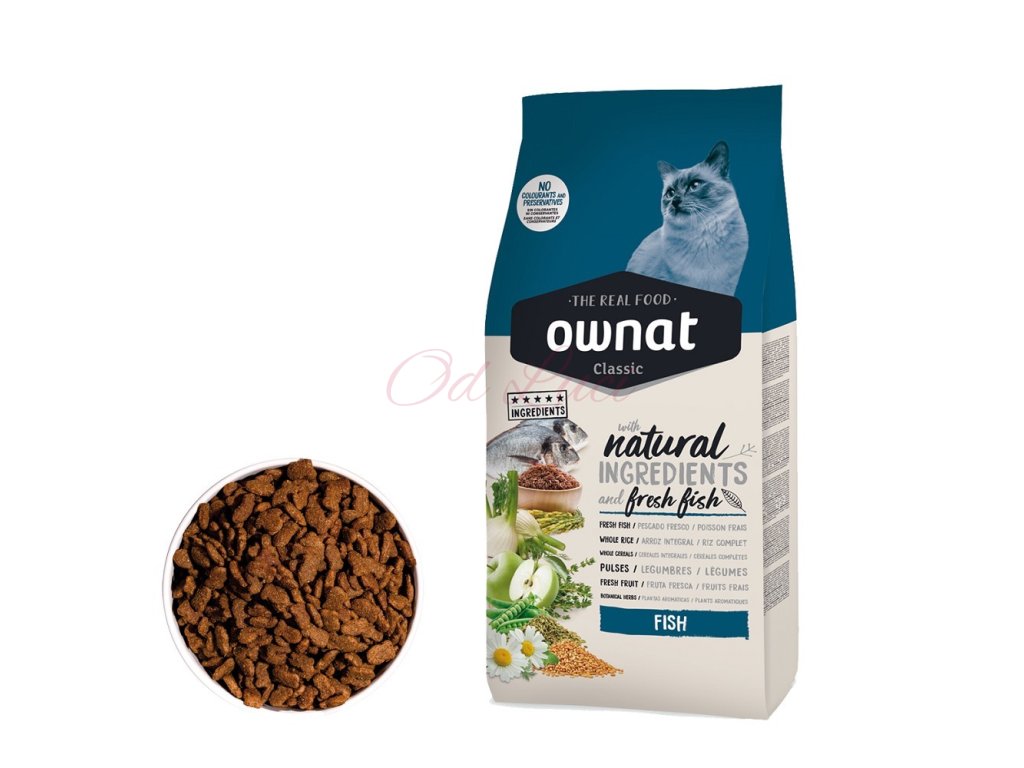 OWNAT CLASSIC CAT Fish kompletní krmivo pro každodenní výživu dospělých koček, které je bohaté na čerstvé ryby a přírodní ingredience. Toto prémiové krmivo obsahuje omega-3 a omega-6 mastné kyseliny, jež přispívají ke zdravé pokožce a lesklé, hedvábné srsti. Je vhodné pro kočky všech plemen a podporuje jejich celkové zdraví.