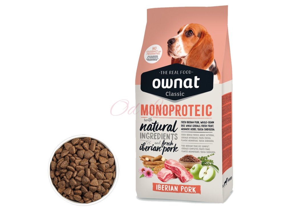 - Přírodní složení: OWNAT CLASSIC MONOPROTEIC DOG Iberian Pork je vyrobeno bez umělých konzervantů, barviv a dochucovadel, což zaručuje, že vašemu psovi dáváte pouze to nejlepší z přírody.