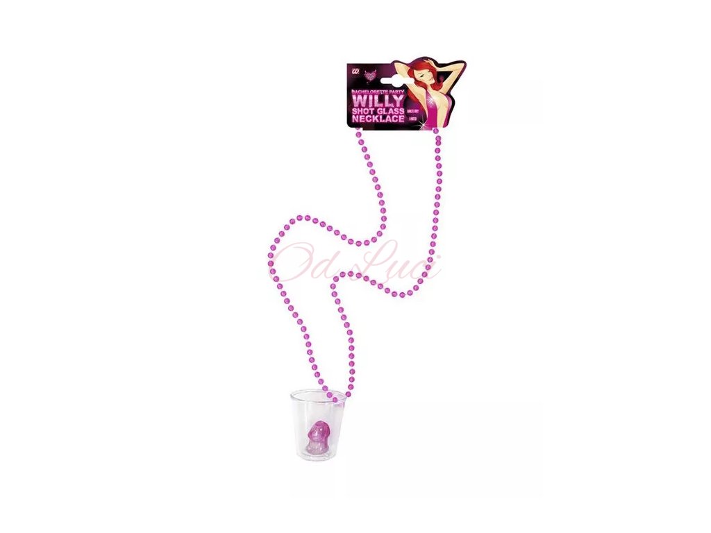 Tento panák s pindíkem na dně je to pravé pro Vaši rozlučku nebo dámskou jízdu! Sklenička je navlečená na růžovém náhrdelníku z korálků.