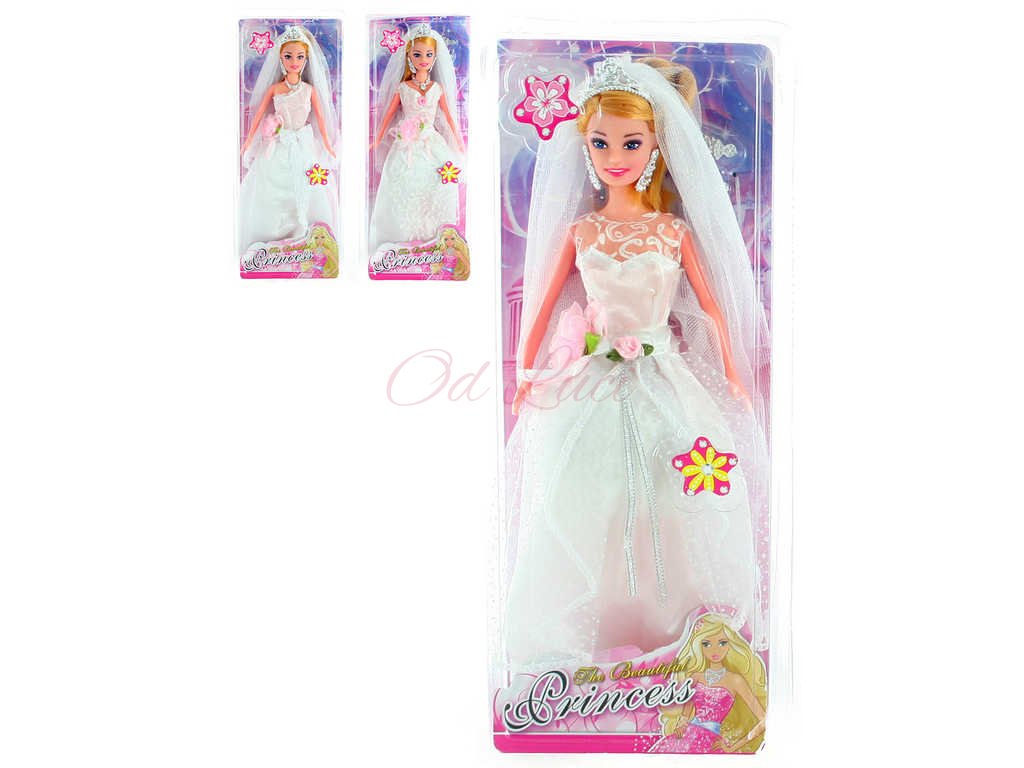 Krásná kloubová panenka princezna, v bílých štech, ve třech variantách provedení. Panenka je oblečena do svatebních šatů, součástí jsou náušnice, korunka a další extra ozdoby. Baleno v krabici.