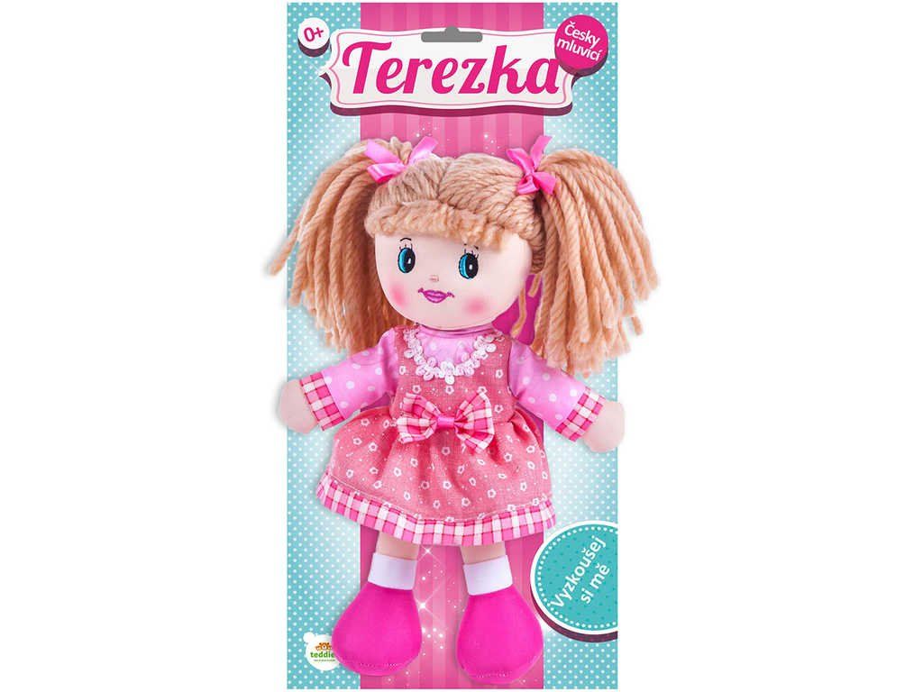 Látková usměvavá panenka Terezka s copánky, s měkkým tělíčkem, která po zmáčknutí bříška povídá: "Mám Tě ráda, Povídej mi pohádku, Já jsem tvoje Terezka, Ty jsi moje nejmilejší kamarádka, Budeme si spolu hrát?" Hračka na baterie se zvukem.