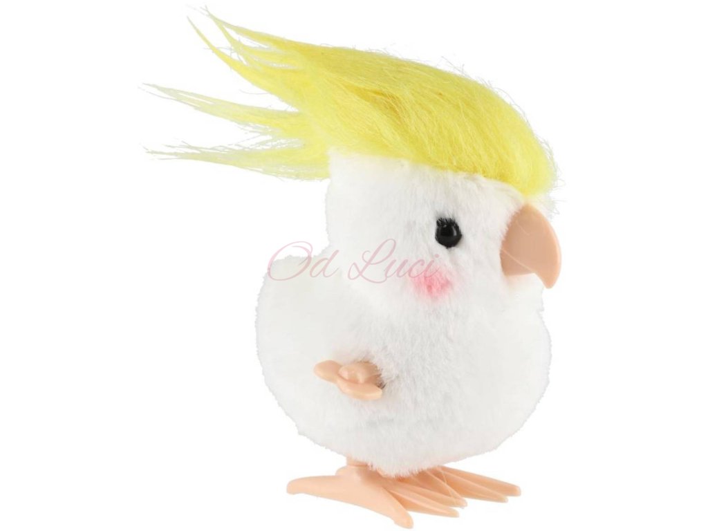 Veselý natahovací papoušek kakadu z plyše a plastu, který po natažení na klíček poskakuje. Velikost 9cm.