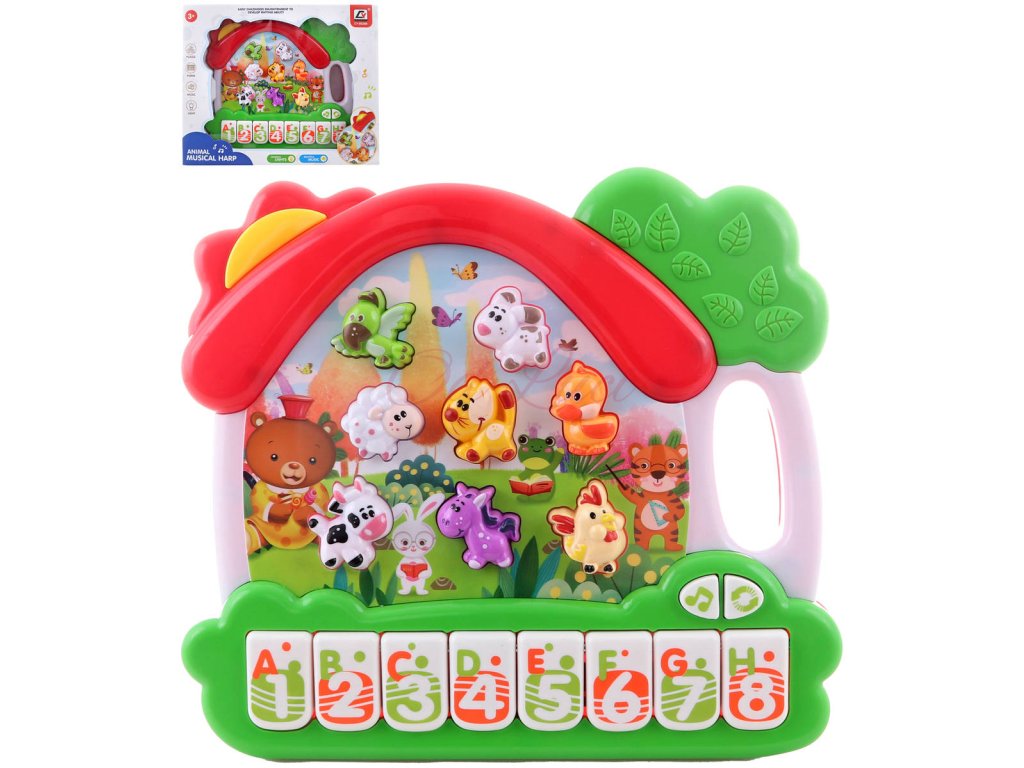 Dětský plastový naučný klavír - domeček se zvířátky, pro nejmenší. Piánko má 8 tlačítek se zvuky zvířátek a 8 tlačítek s čísly (mluví anglicky). Hračka na baterie, se světlem a zvukem. Velikost 23cm.