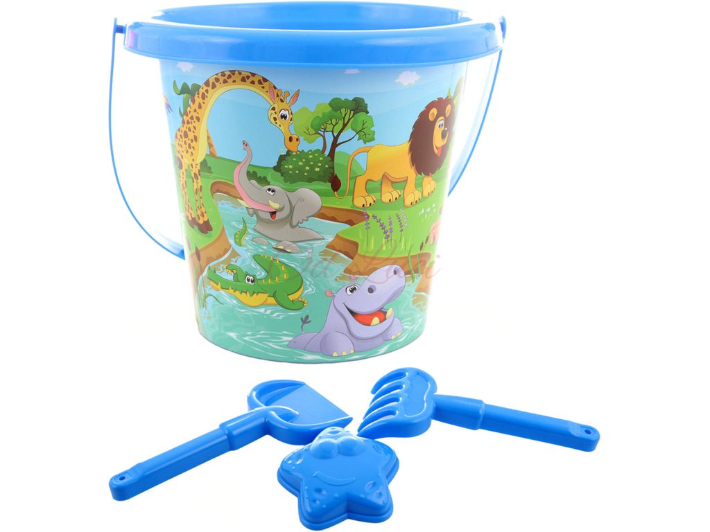 Dětský modrý pískový set na písek. Součástí je kyblík 15cm s obrázkem "zvířátka Safari", 2 pracovní nástroje (lopatka, hrábě) a formička - hvězdička. Baleno v síťce.