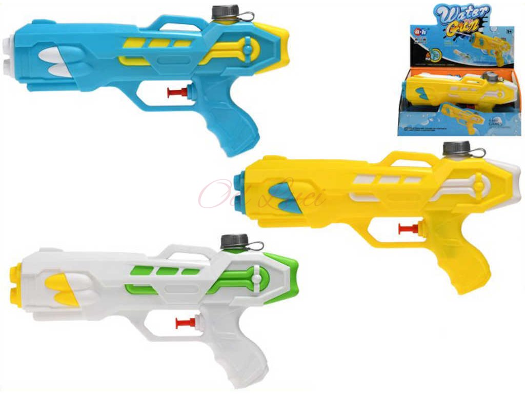 Dětská lehká plastová pistolka s nádržkou na vodu, ve třech barevných variantách. Baleno volně.