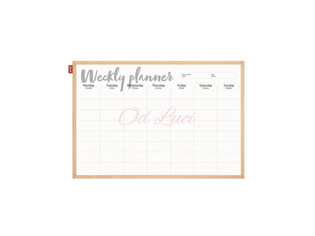 Týdenní magnetická tabule v dřevěném rámu se základní sadou.
