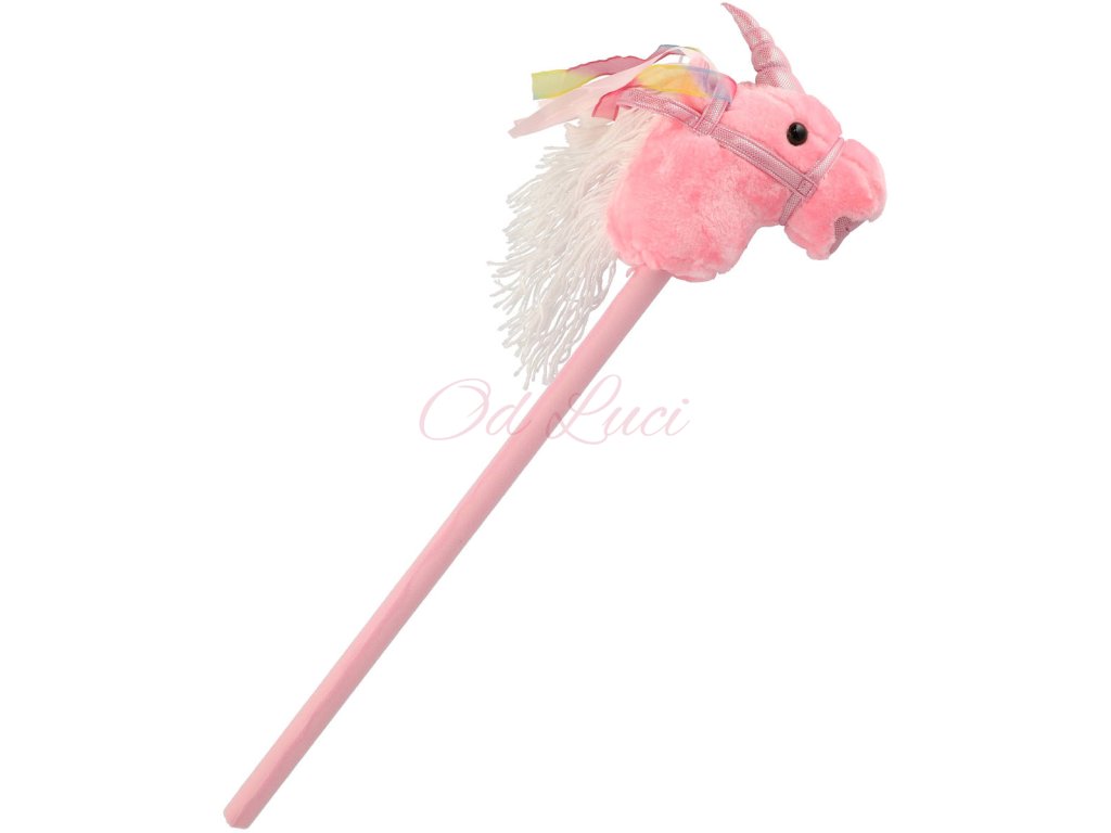 Plyšový kůň jednorožec růžový na tyči, celková délka 80cm, koňská hlava na baterie, se zvukem.