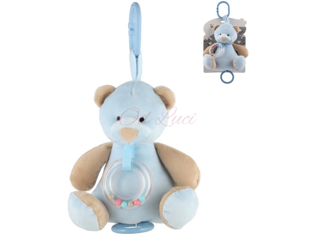 Závěsné plyšové zvířátko medvídek s hracím strojkem na natažení, usínáček s chrastítkem, s melodií, na postýlku / kočárek, pro nejmenší děti, pro miminko. Velikost 18cm.