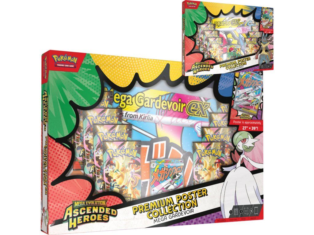 Se silnými útoky a vysokým počtem HP prorazí Mega Lucario ex a Mega Gardevoir ex všechny hranice v boji! Spoj se s jedním z těchto mocných Mega Evolution Pokémonů ex jako full-art foil promo kartou a objev další Pokémony v balíčku 10ti boosterů z rozšíření Mega Evolution—Ascended Heroes. Součástí je také velký plakát zobrazující Mega Lucaria nebo Mega Gardevoir a další Pokémony z tohoto rozšíření.