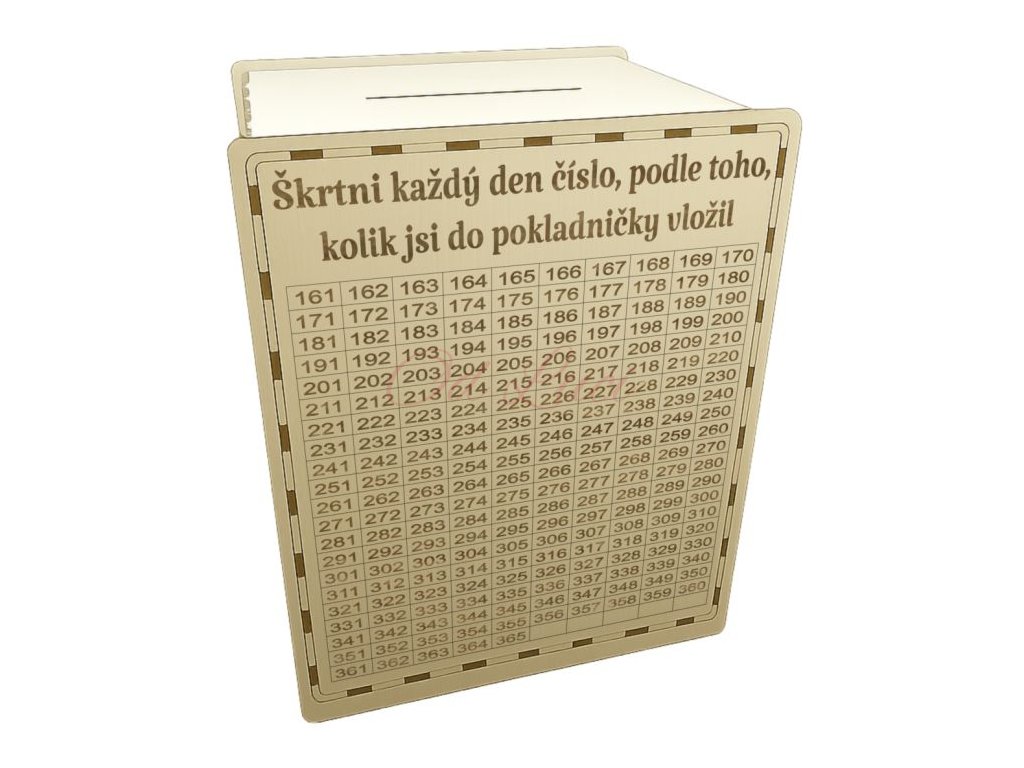 Tato jedinečná Pokladnička 365 dní je skvělým způsobem, jak si každý den spořit peníze. Na pokladničce jsou vyobrazeny čísla 1-365, což odpovídá počtu dní v roce. Každý den si zaškrtněte pole s částkou, kterou vložíte do pokladničky. Po jednom roce, když vyškrtnete všechna pole, dosáhnete celkové naspořené částky 66 795 Kč. Perfektní pro ty, kteří chtějí systematicky spořit a mít kontrolu nad svými úsporami.