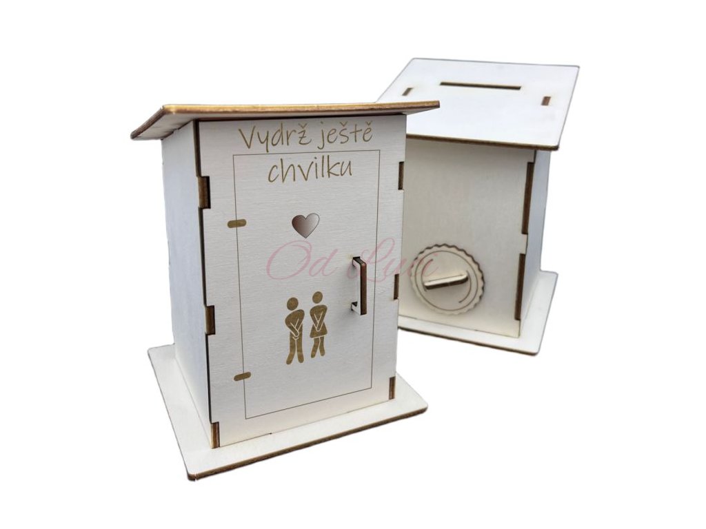 Zábavná dřevěná pokladnička ve tvaru kadibudky s textem „Vydrž ještě chvilku“. Skvělý tip na dárek pro kamarády, rodinu i kolegy, kteří si umí udělat legraci a mají smysl pro humor. Kvalitní provedení a originální design potěší každého!