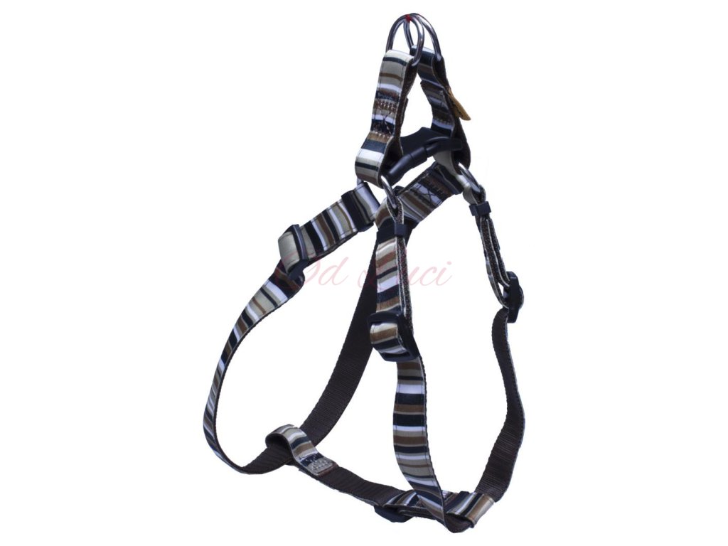 Postroj z popruhového materiálu se sublimačním potiskem v designu proužků, je velmi měkký a příjemný. Kšírky jsou pevně prošité, na všech částech je možnost nastavení pro obvod krku, hrudního koše a hrudníku.
