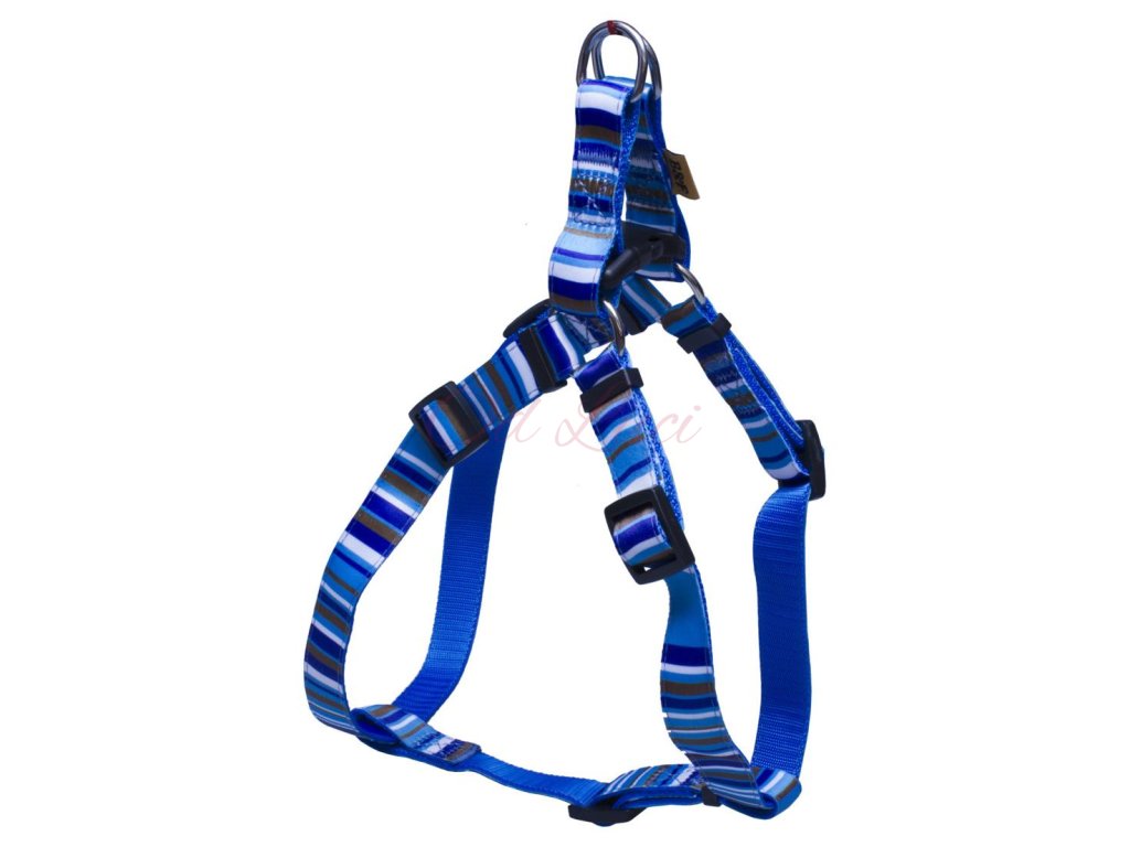 Postroj z popruhového materiálu se sublimačním potiskem v designu proužků je velmi měkký a příjemný. Postroj je pevně prošitý, na všech částech je možnost nastavení pro obvod krku, hrudního koše a hrudníku.