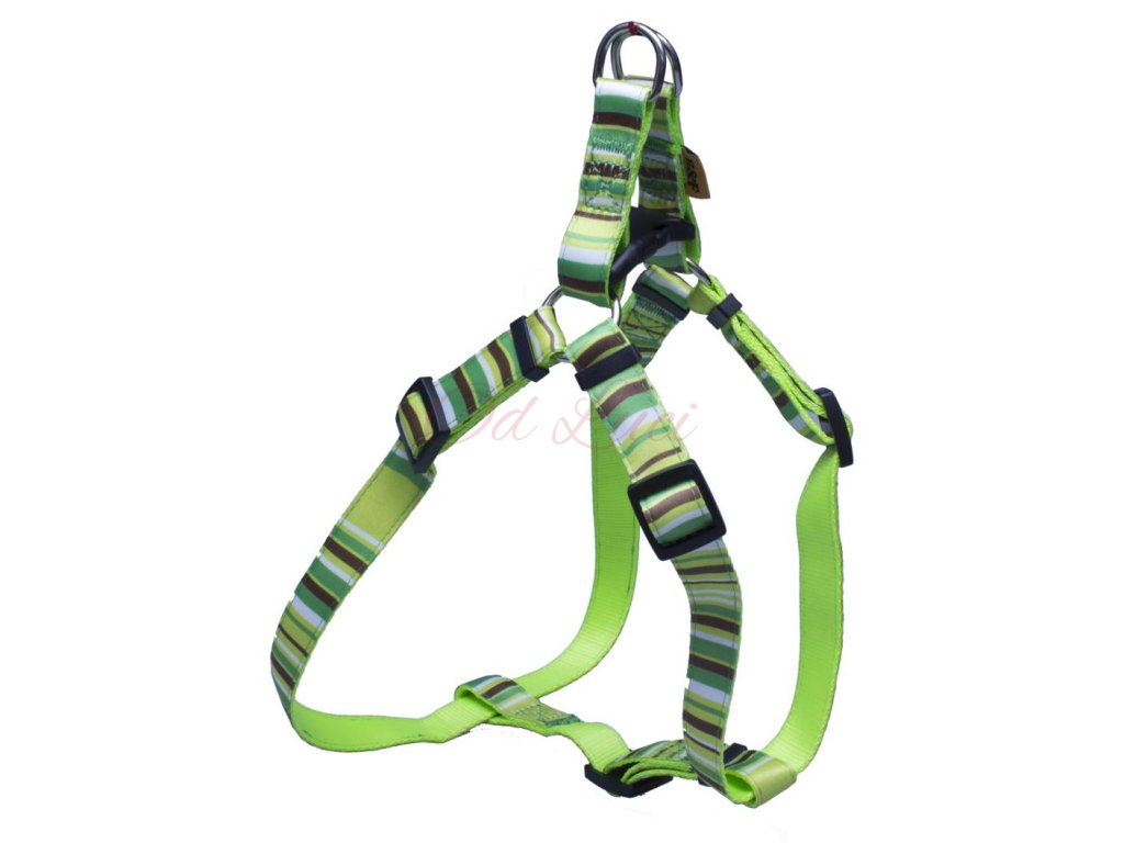 Postroj z popruhového materiálu se sublimačním potiskem v designu proužků, je velmi měkký a příjemný. Kšírky jsou pevně prošité, na všech částech je možnost nastavení pro obvod krku, hrudního koše a hrudníku.