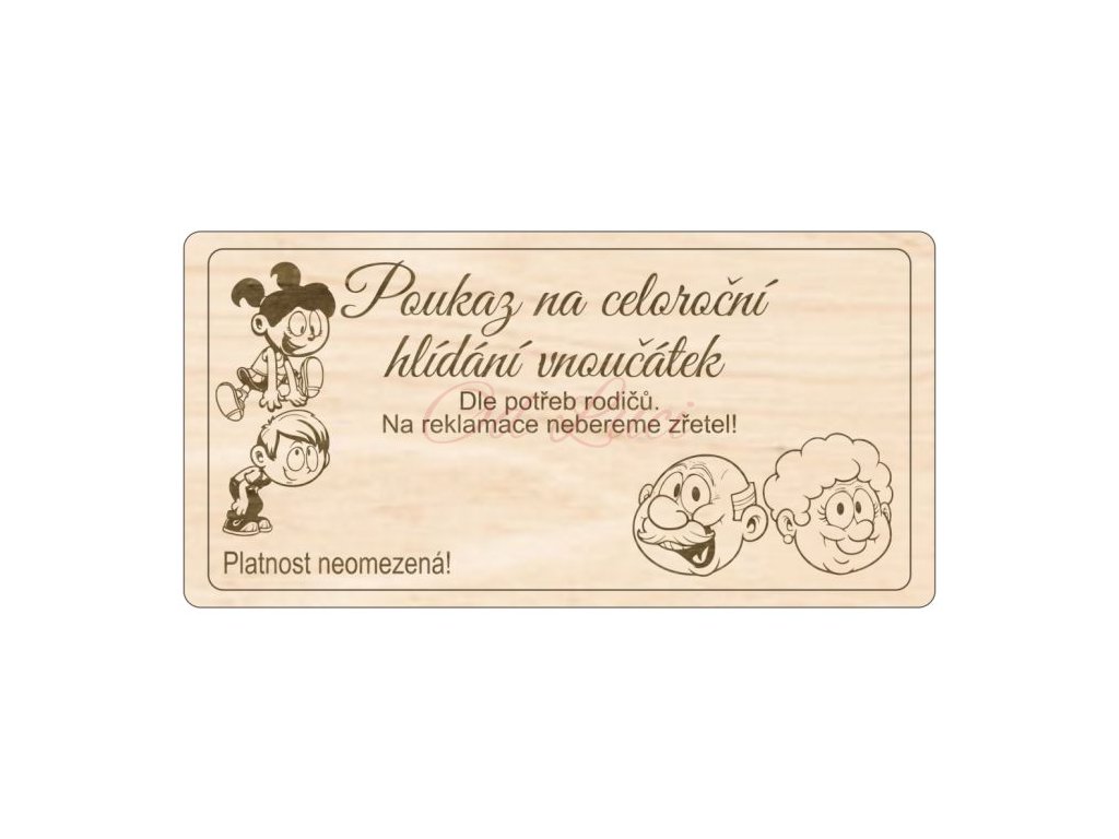 Tato dřevěná destička s textem "Poukaz na celoroční hlídání vnoučátek. Dle potřeb rodičů. Na reklamace nebereme zřetel. Platnost neomezená" je skvělým způsobem, jak věnovat nezapomenutelný a praktický dárek.