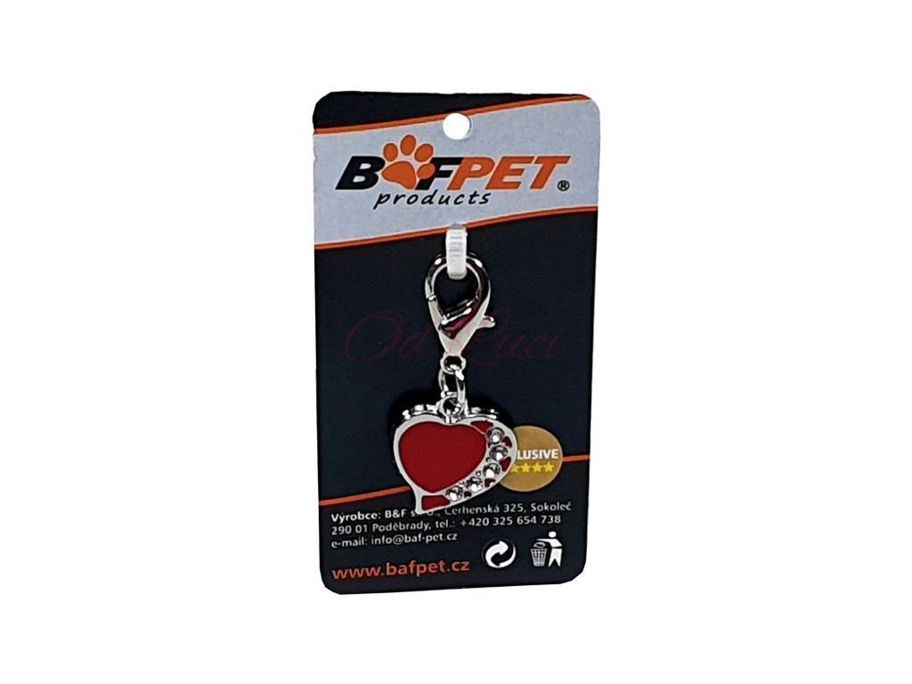 Přívěsek ve tvaru srdíčka zčásti s čirými kamínky a zčásti vybarvené červenou barvou je vybaven malou karabinkou a proto jej lze použít jako přívesek pro malá plemena, klíčenku nebo na mobil.