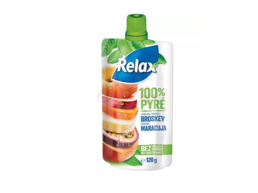 Relax 100% pyré jablko-mrkev-broskev-banán-maracuja 120g. 100% husté pyré z ovoce a mrkve, částečně vyrobené z protlaků a koncentrovaných šťáv s přídavkem vitaminu C. Bez přídavku cukrů.