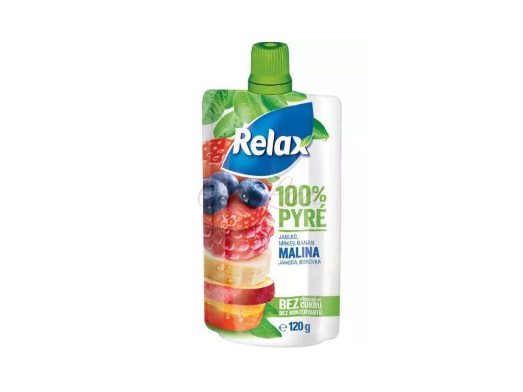 Relax 100% pyré jablko-mrkev-banán-malina-jahoda-borůvka 120g. 100% husté pyré z ovoce a mrkve, částečně vyrobené z protlaků a koncentrovaných šťáv. Bez přídavku cukrů.