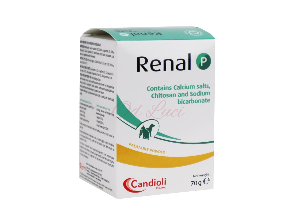 Renal P obsahuje vápenaté soli (uhličitan a laktát glukonát v určeném poměru), chitosan a hydrogenuhličitan sodný. Tento produkt je cíleně určen pro regulaci hyperfosfatemie a metabolické acidózy. Produkt byl testován jak u psů, tak i koček postižených CKD po dlouhou dobu podávání (180 dní nepřetržitě)a ukazuje velmi dobré výsledky o jeho účinnosti a bezpečnosti (žádná hyperkalcémie nebyla zjištěna u všech pacientů).