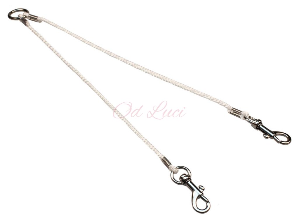 Rozdvojka je opatřená pochromovaným kroužkem pro zaháknutí karabiny vodítka. Spoje lana u karabiny jsou svařeny a zpevněny kovovou sponou. Dvě hákové kované pochromované karabiny pro připevnění k obojkům psů.