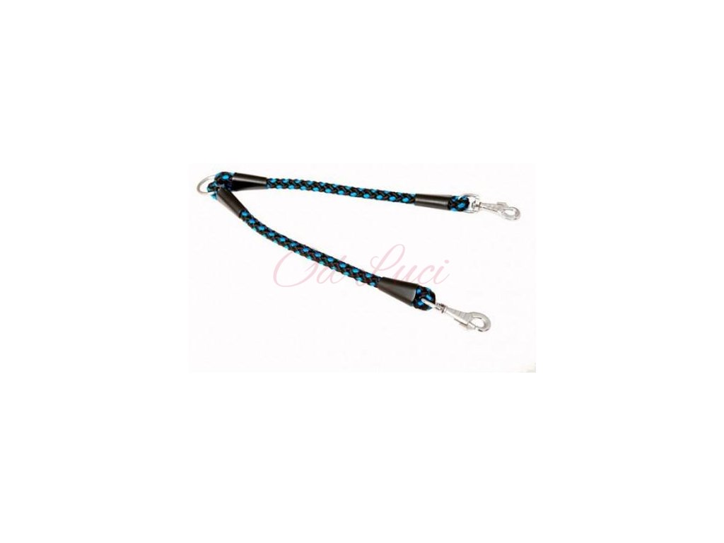 Nylonová rozdvojka pro psy malých a středních plemen, opatřená pochromovaným kroužkem pro zaháknutí karabiny vodítka. Spoje lana u karabiny jsou svařeny a zakryty plastovými zakončovacími krytkami. Dvě hákové kované pochromované karabiny pro připevnění k obojkům psů.