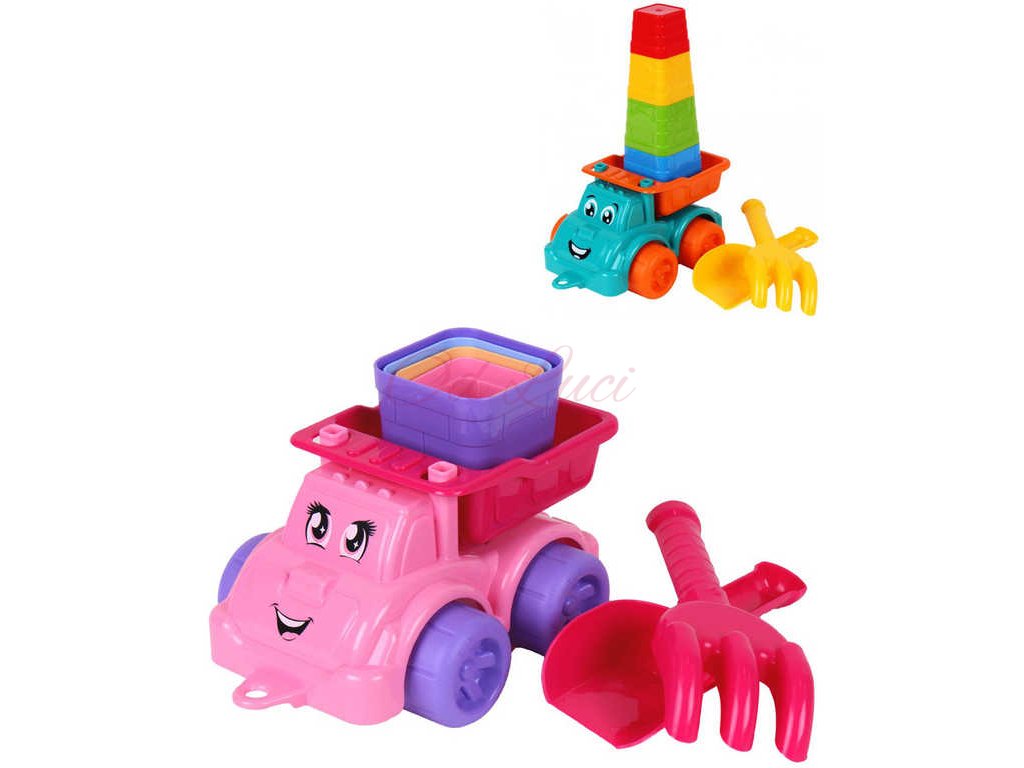 Plastový pískový set ve dvou veselých barevných variantách - pro kluky, nebo pro holky, pro všechny malé stavitele, na pískoviště. Součástí balení je nákladní autíčko sklápěčka s obličejem, lopatka, hrábě, a 4