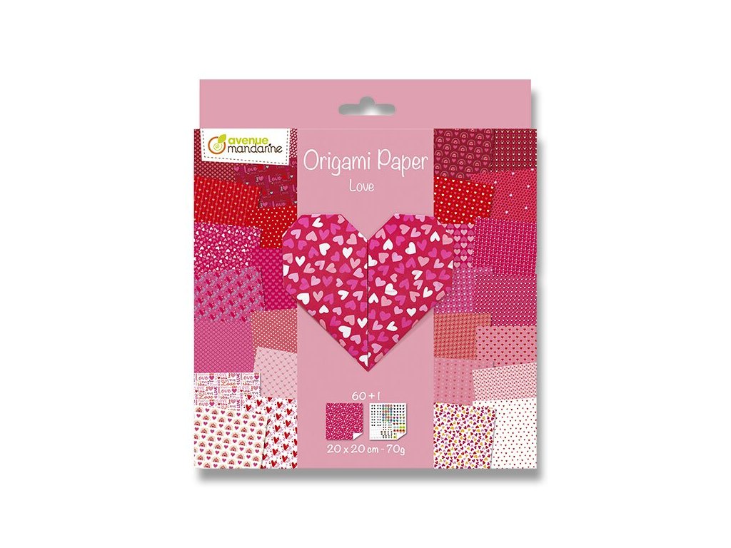 Oboustranně potištěné papíry pro skládání Origami s motivy srdce. Balení obsahuje 60 listů a speciální arch se samolepkami očí různých tvarů, barev a výrazů. Gramáž 70 g. ,,Rozměr papírů: 20 x 20 cm