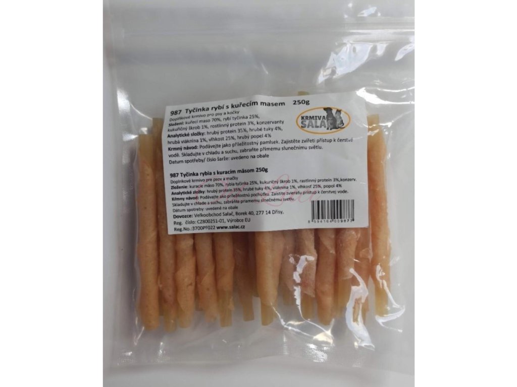 Složení: kuřecí maso 70%, rybí tyčinka 25%, kukuřičný škrob 1%, rostlinný protein 3%, konzervanty