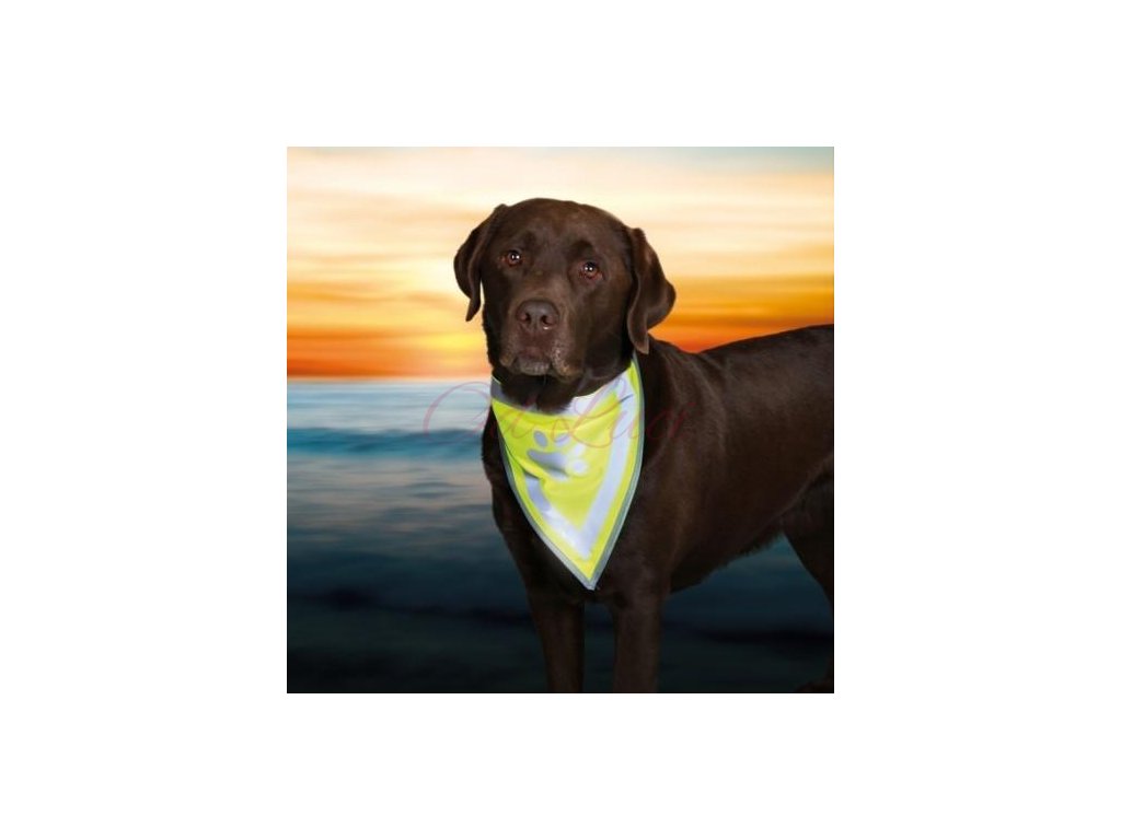 Bezpečnostní šátek je vyroben z neonově žlutého polyesteru, je ozdoben reflexními pruhy a tlapkou. Tím je zaručena perfektní viditelnost psa ve dne i v noci. Užijte si svobodné procházky - i za tmy bude Váš čtyřnohý přítel na dálku vidět.