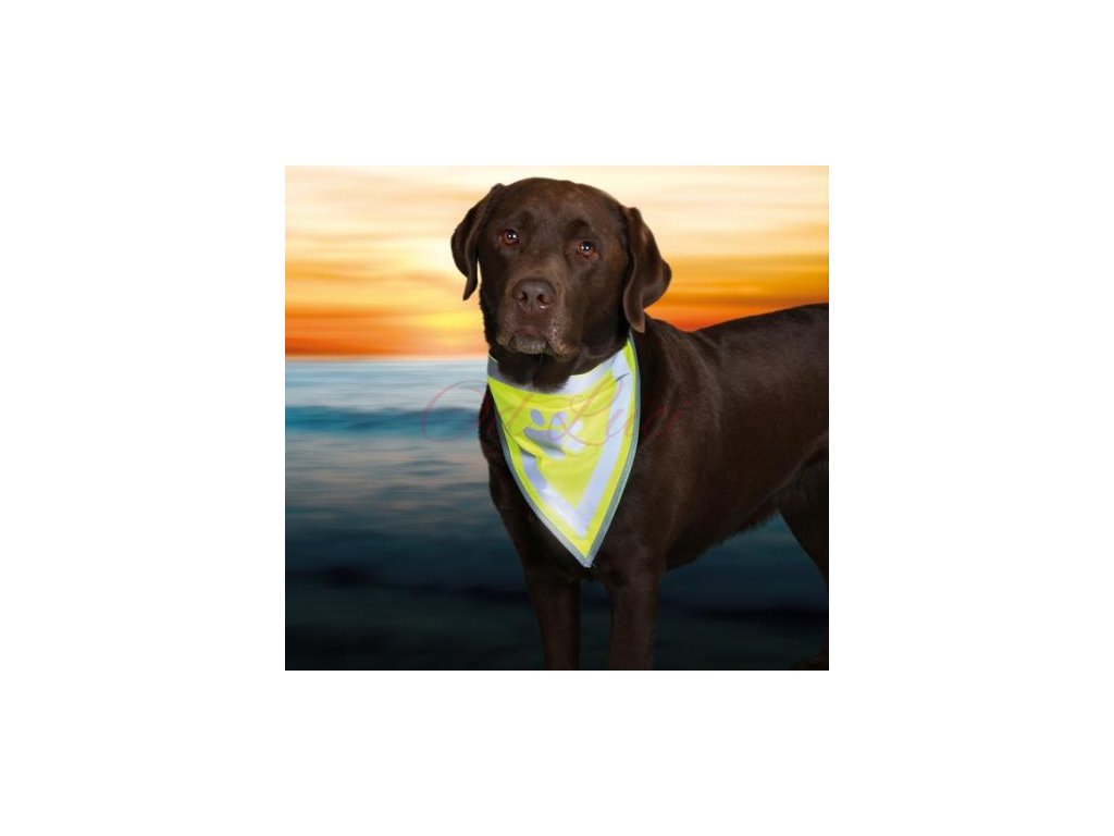 Úžasný bezpečnostní šátek pro každého pejska. Je vyroben z výrazně žlutého polyesteru, je ozdoben reflexními pruhy a tlapkou. Tím je zaručena perfektní viditelnost psa ve dne i v noci a současně. Užijte si svobodné procházky - i za tmy bude Váš čtyřnohý přítel na dálku vidět.