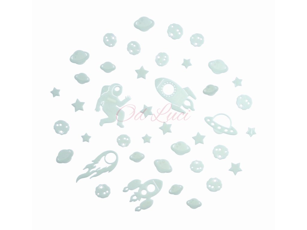 Sada fluorescenčních hvězdiček, astronauta, vesmírné lodi a dalších motivů, které po nasvícení ve tmě svítí. Dekorace vhodná k nalepení na stěnu, strop či nábytek.