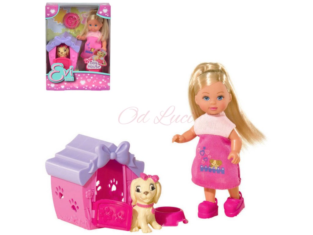 Panenka Evička Evi Love má psího mazlíčka, který dostal novou boudu. Evička s psí boudou, pejskem a miskou. Výška panenky: 12cm.