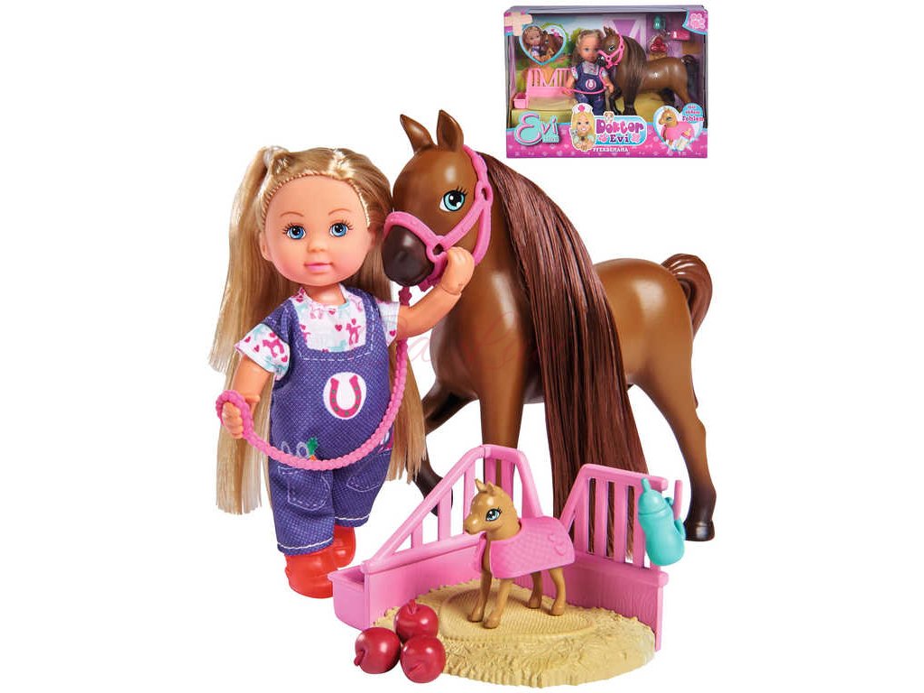 Panenka Evička Veterinářka pomáhá na svět hříbátku. S klisnou, hříbátkem, pelíškem pro hříbátko a příslušenstvím. Baleno v krabici.