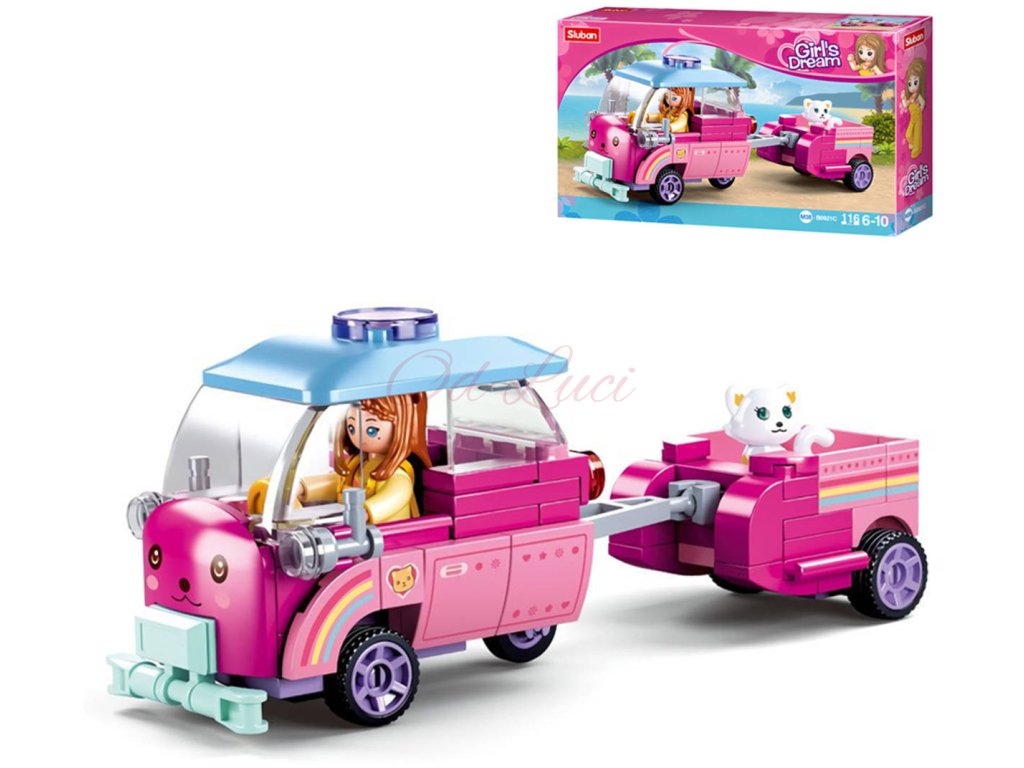 SLUBAN Girls Dream (M38-B0921C) Kočičí automobil s vlečkou. Kvalitní plastová stavebnice. Lze kombinovat s většinou ostatních známých stavebnic. Součástí 1 figurka.