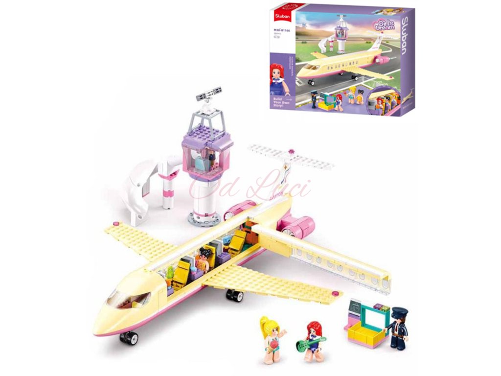 Stavebnice Sluban Girls Dream M38-B1166 Luxusní letadlo obsahuje 384 dílků a po sestavení je letadlo dlouhé téměř 40 cm. Součástí stavebnice je pět figurek (pilotka, letuška, tři cestující), řídící věž a bezpečnostní odbavovací pult Check-in. Letadlo má odnímatelnou střechu kokpitu, což umožňuje snadný přístup k figurce pilotky a ovládacím prvkům. Kabina pro cestující je navržena s možností otevření celého boku, což usnadňuje hraní s figurkami cestujících a letušky. V interiéru jsou tři prostorná sedadla, každé vybavené vlastní LCD obrazovkou a stolkem pro pohodlí během letu. Součástí stavebnice je také řídící věž se skluzavkou.