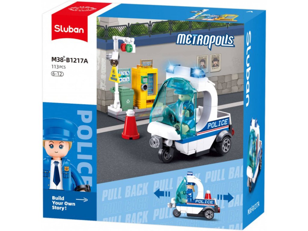 SLUBAN M38-B1217A Auto tříkolka Policie, s pohonem na zpětné natažení, z edice Metropolis. Kvalitní plastová stavebnice. 113 dílků + 1 figurka. Lze kombinovat s většinou ostatních známých stavebnic.