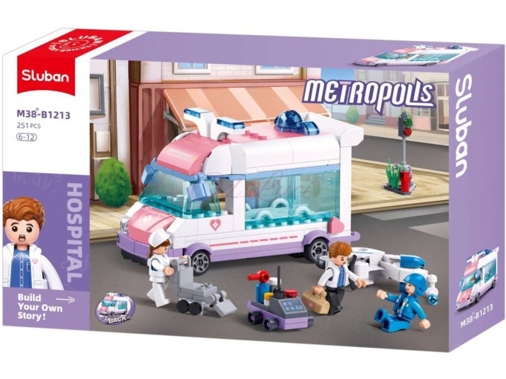 SLUBAN M38-B1213 Pojízdná záchranná služba první pomoci s pohonem na zpětný chod, z edice Metropolis. Kvalitní plastová stavebnice. 251 dílků + 3 figurky. Lze kombinovat s většinou ostatních známých stavebnic.