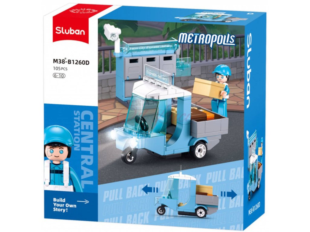 Stavebnice je ideální pro malé fanoušky pošty a doručování. Zahrnuje modré doručovací vozidlo ve formě tříkolky, které po sestavení měří 12,3 cm a má natahovací funkci. Vozidlo je navrženo s prostorem pro balíky, což přináší realistické herní zážitky. Součástí balení je také doručovací stanice s poštovními schránkami, což umožňuje dětem vytvářet scénáře doručování pošty a balíků.