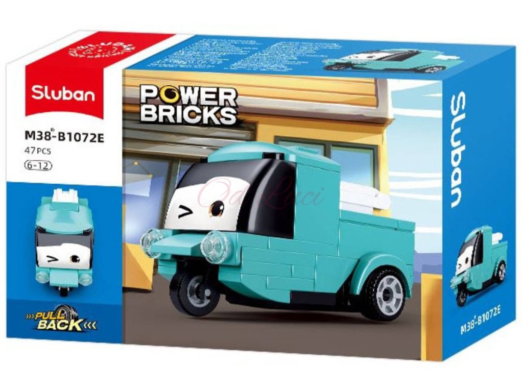 SLUBAN M38-B1072F Nákladní tyrkysové auto s očima, s pohonem na zpětné natažení, z edice Power Bricks. Kvalitní plastová stavebnice, 47 dílků. Lze kombinovat s většinou ostatních známých stavebnic.