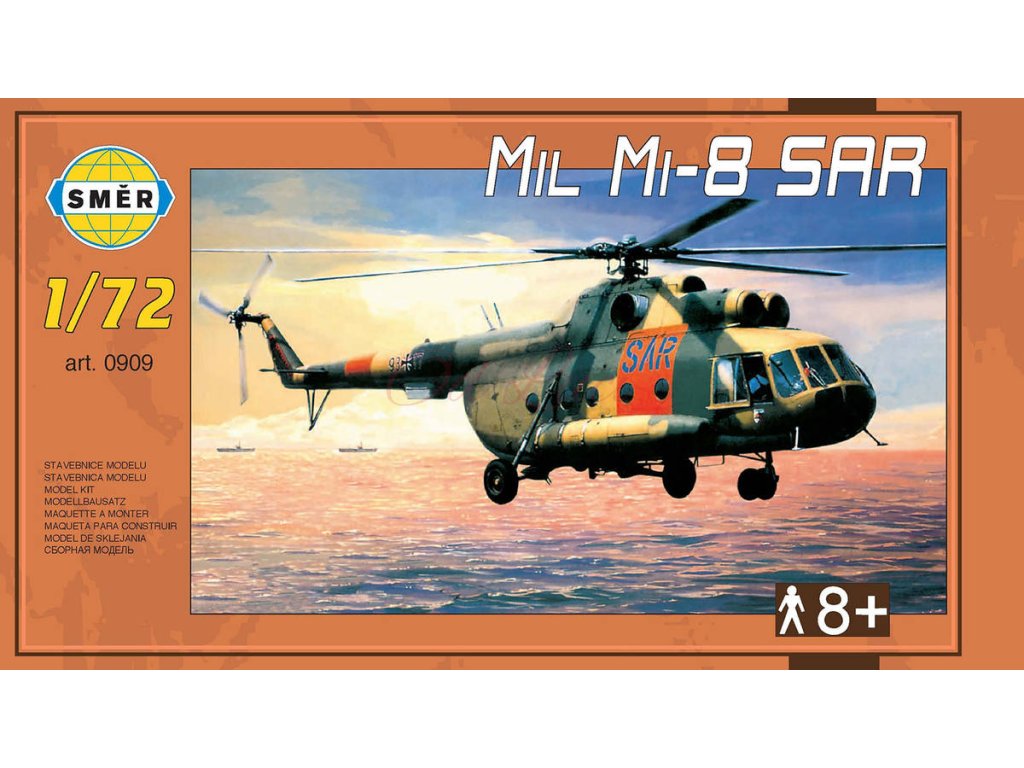 SMĚR 0909 - helikoptéra Mil Mi-8 SAR. Modelářská plastová stavebnice. Model vrtulníku určený ke slepení. 101 dílků. Velikost modelu 29,5 x 25cm.
