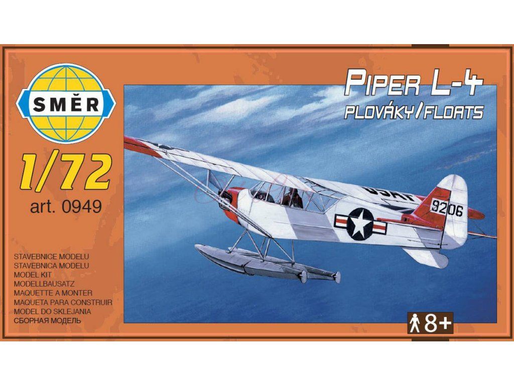 SMĚR 0949 - letadlo Piper L-4 s plováky. Modelářská plastová stavebnice. Model letadla určený ke slepení. 50 dílků. Měřítko 1:72. Velikost modelu 9,5 x 14,5cm.