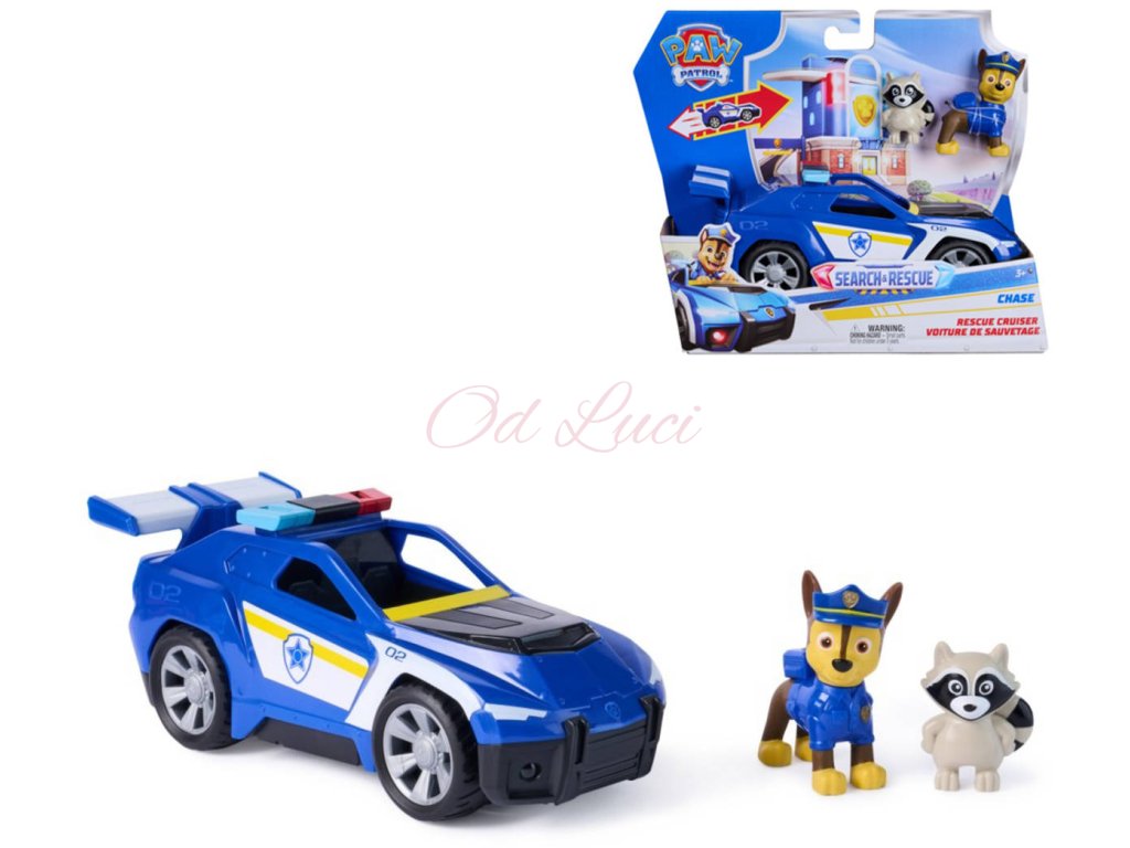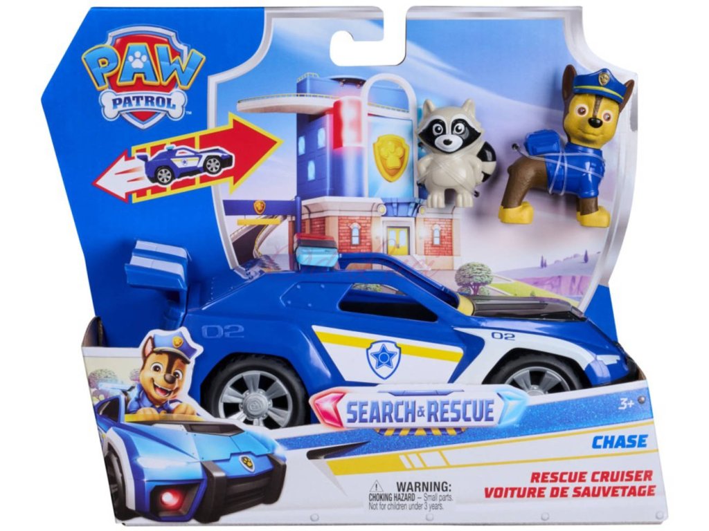 Tématické záchranářské vozidlo Paw Patrol Search and Rescue - Chase. Velikost vozidla 15cm. Součástí 2 zvířátka.