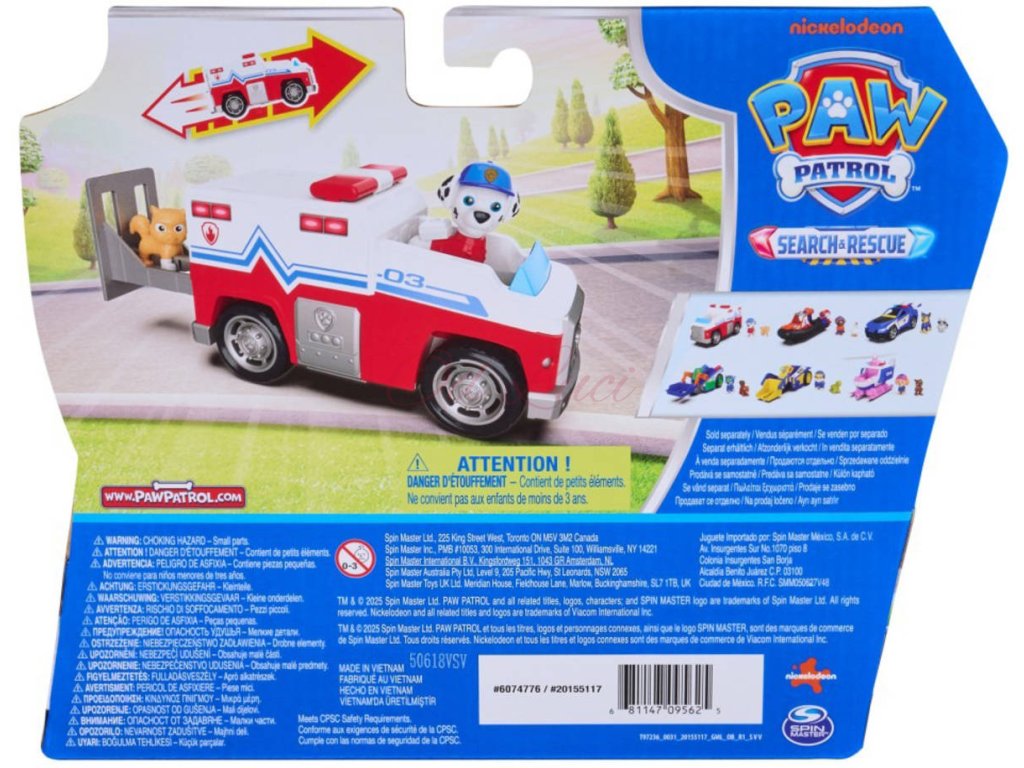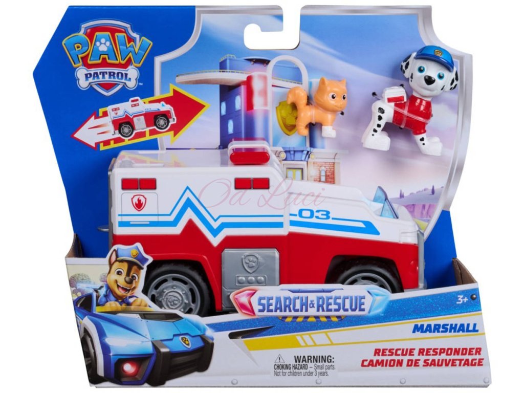 Tématické záchranářské vozidlo Paw Patrol Search and Rescue - Marshall. Velikost vozidla 15cm. Součástí 2 zvířátka.