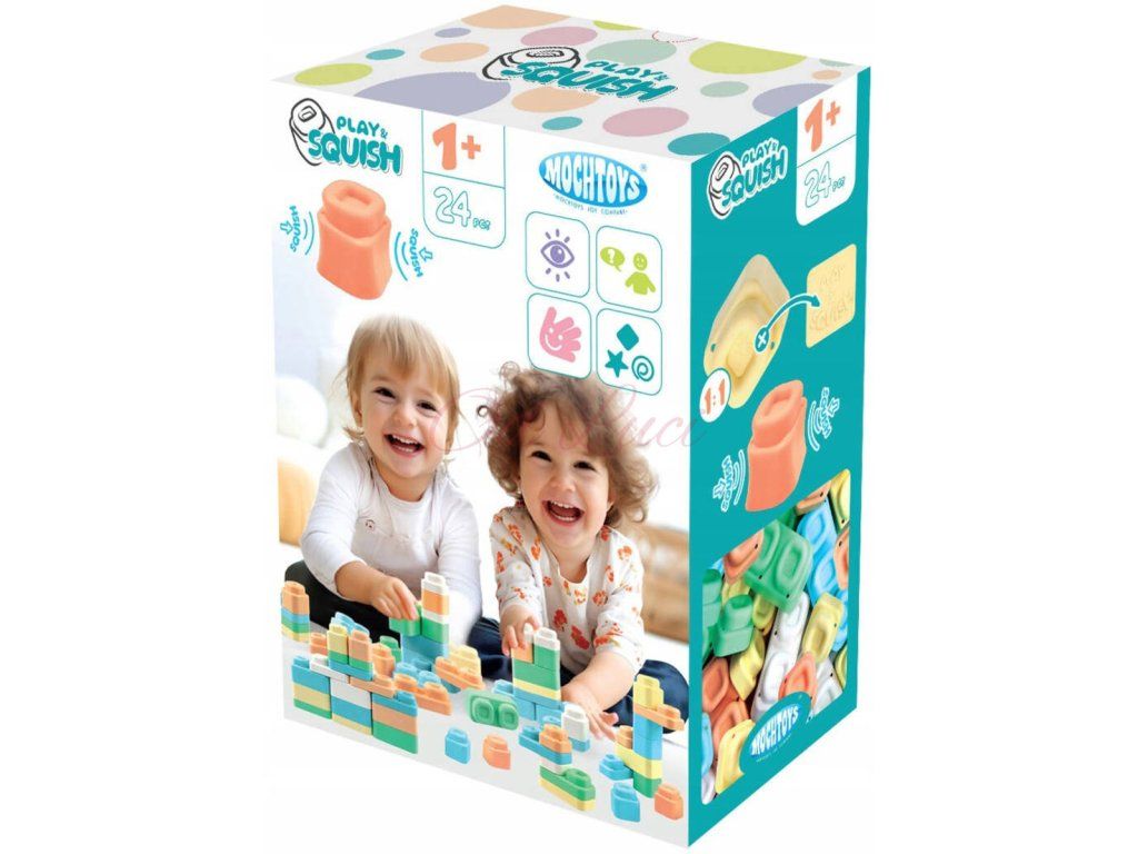 Play&squish jsou měkké kostky navržené pro naprosto bezpečnou zábavu dětí od 12 měsíců. Měkké, bezpečné a lehké. Ideální pro procvičování zvedání, skládání a hraní. Přizpůsobeno potřebám a dovednostem malých dětí.