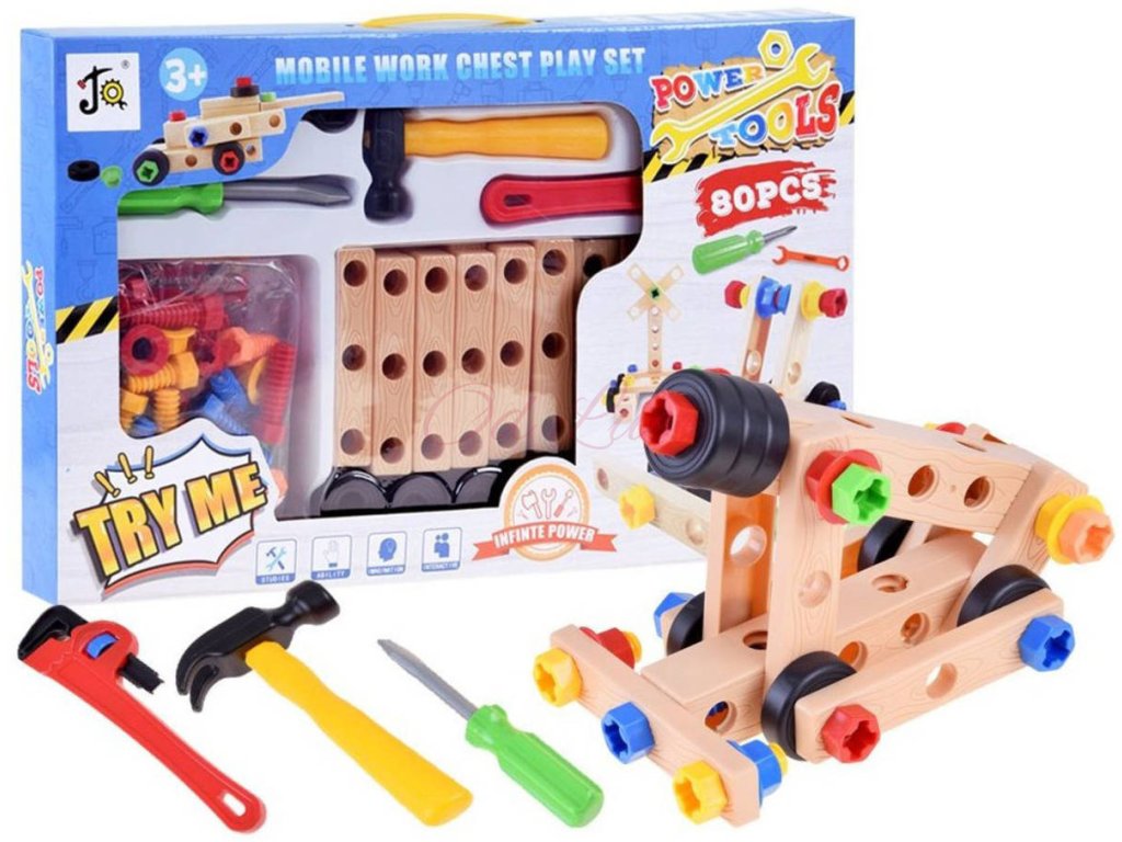 Konstrukční plastová 3D stavebnice. Součástí dětské pracovní nástroje, šrouby, matice a další. Imitace dřeva. Celkem 80 dílků.