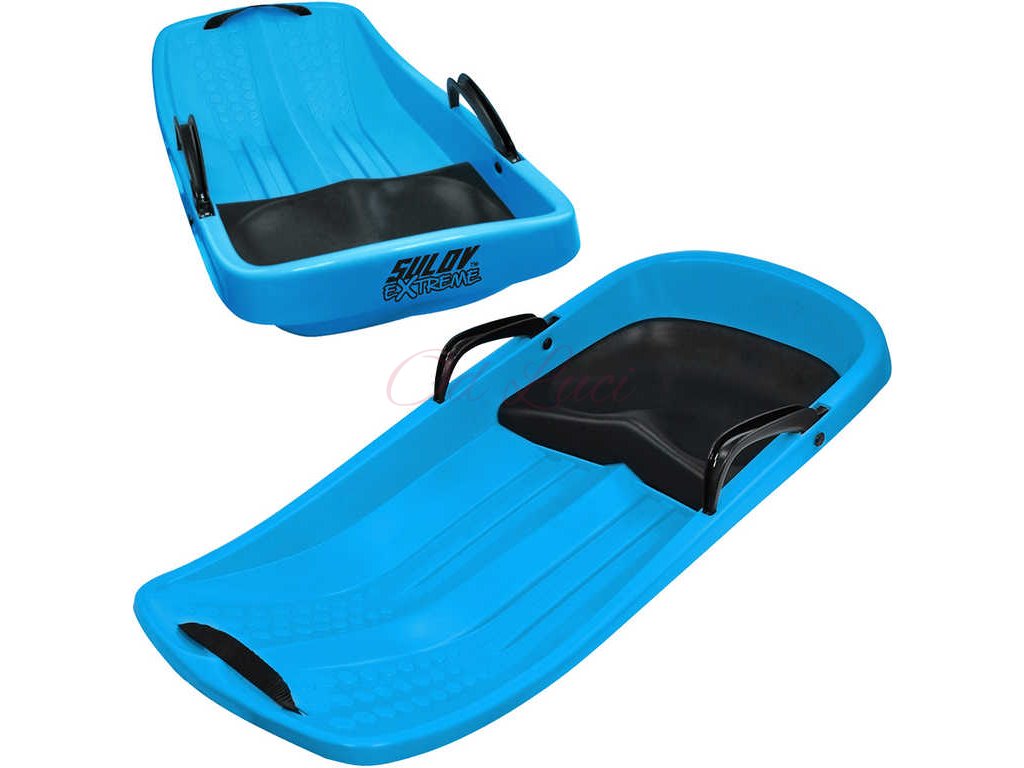 Tradiční jednomístný plastový bob pro děti na sníh, z plastu v modré barvě, s vestavěným sedátkem, které lépe chrání dítě před chladem, vynikající praktickým tvarem a velmi pevnou konstrukcí.